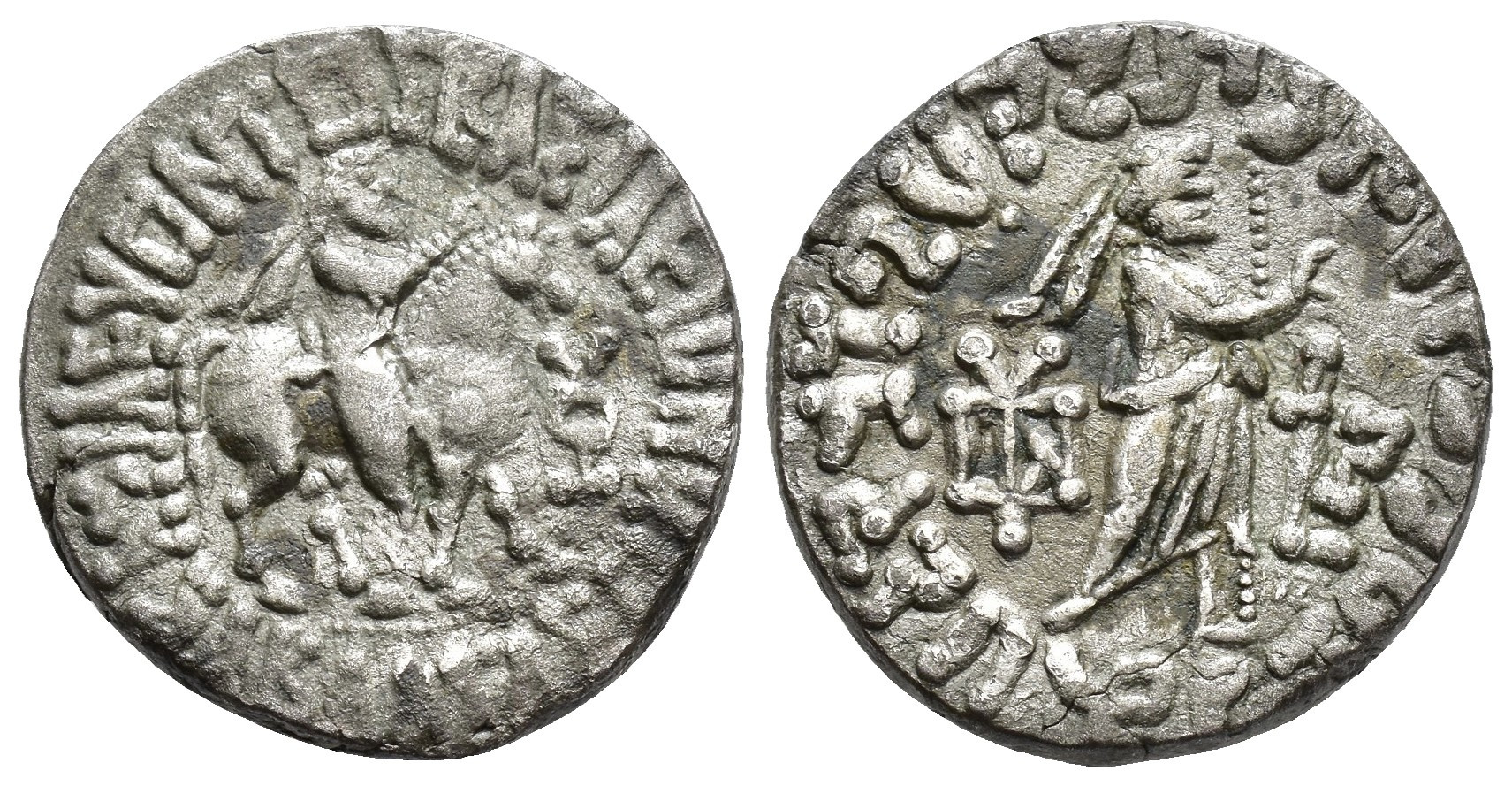 GRECIA ANTIGUA. BACTRIA-INDOESCITAS. Tetradracma. Abdagases (55-65 d.C.). A/ El rey a caballo a der., delante monograma. R/ Zeus con cetro a der., monogramas. AR 9,9 g. 23,04 mm. Mit.-2583. Leves oxidaciones. MBC/MBC+.