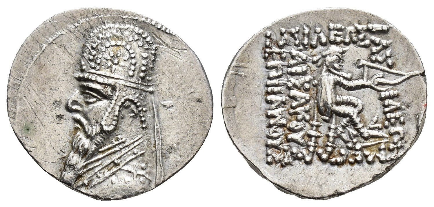 GRECIA ANTIGUA. PARTIA. Dracma. Mitrídates II (c. 123-88 a.C.). A/ Busto con tiara a izq. R/ Arquero sentado a der. AR 4,1 g. 19,01 mm. SEP-28. Rayas. EBC-.
