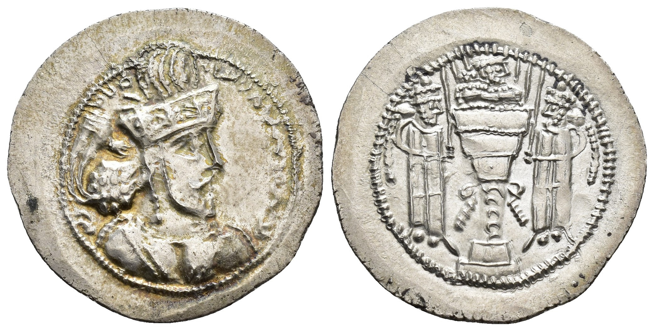 GRECIA ANTIGUA. IMPERIO SASÁNIDA. Dracma. Sapur III (383-388). A/ Busto con tiara a der. R/ Dos figuras flanqueando altar del fuego. AR 3,99 g. 28,2 mm. SES-107. EBC.