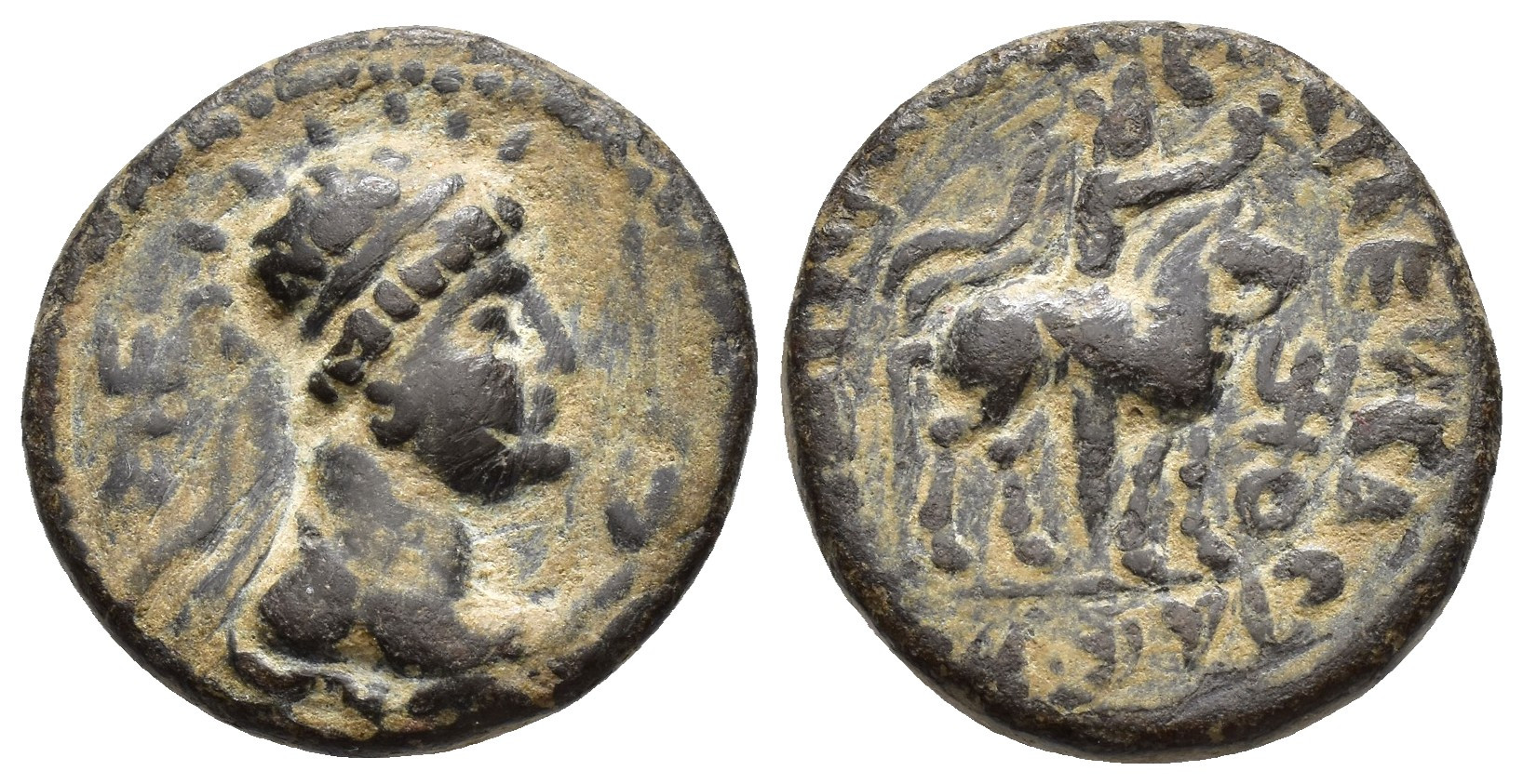 GRECIA ANTIGUA. IMPERIO KUSAHN. Tetradracma. Soter (80-90 d.C.). A/ Busto diademado y con cetro a der. R/ Jinete a der. AR 7,76 g. 22,1 mm. Senior-B 17.1. Pátina oscura. MBC-.