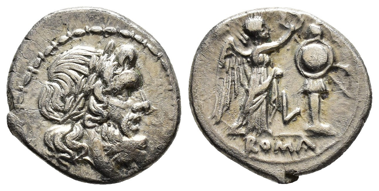 REPÚBLICA ROMANA. EMISIONES ANÓNIMAS. Luceria. Victoriato (211-208 a.C.). A/ Cabeza de Júpiter a der. R/ Victoria coronando trofeo a der., L en campo, en exergo ROMA. AR 2,88 g. 17,3 mm. CRAW-97.1b. MBC+/MBC.