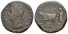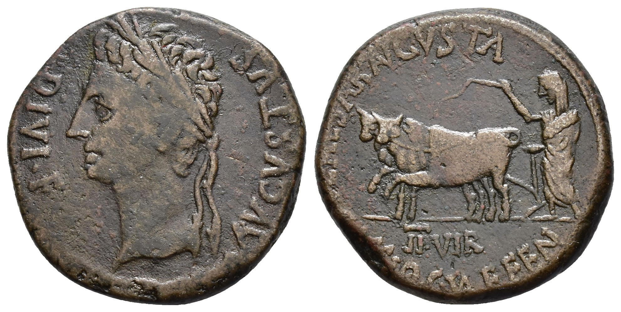 HISPANIA ANTIGUA. CAESARAUGUSTA. Augusto. As. A/ Cabeza laureada a izq.; DIVI F AVGVSTVS. R/ Sacerdote guiando yunta fundacional a izq., CAESAR AVGVSTA-(L CASSI)O C VAL FEN)/ II VIR. AE 11,7 g. 26,7 mm. I-318; APRH-309; ACIP-3033. BC+/MBC-.