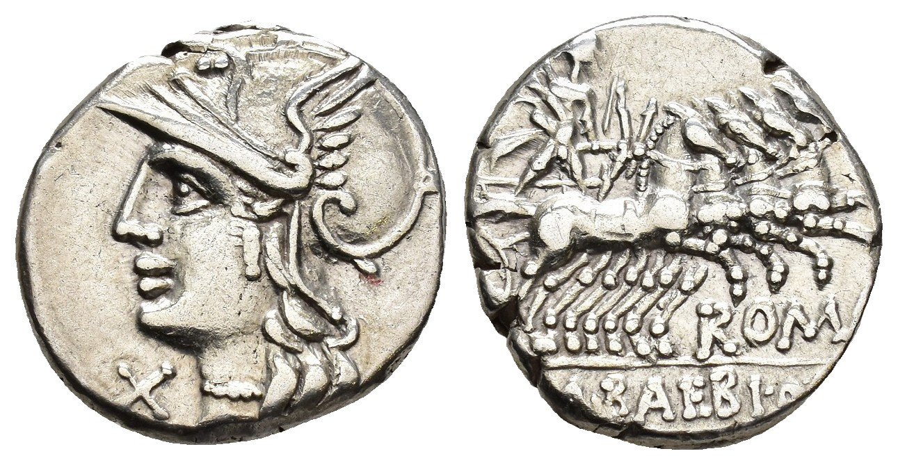 REPÚBLICA ROMANA. BAEBIA. Marcius Baebius Q. f. Tampilius. Denario. Roma (137 a.C.). A/ Cabeza de Roma a izq., detrás TAMPIL. R/ Apolo en cuadriga; ROMA/ M. BAEBI Q (F). AR 3,94 g. 17,3 mm. CRAW-236.1; FFC-198. MBC.