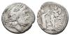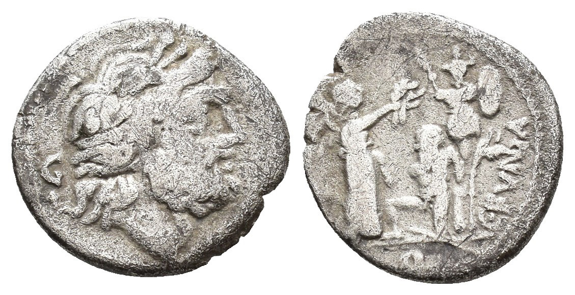 REPÚBLICA ROMANA. FUNDANIA. C. Fundanius. Quinario. Roma (101 a.C.). A/ Cabeza de Júpiter a der., detrás G. R/ Victoria a der., delante trofeo con cautivo de rodillas a sus pies; detrás C FVNDA, exergo Q. AR 1,79 g. 14,4 mm. CRAW-326.2. Pequeñas marcas. BC+.