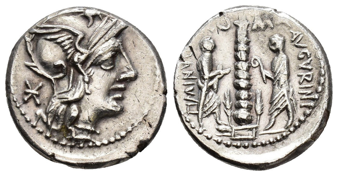 REPÚBLICA ROMANA. MINUCIA. Ti. Minucius Augurinus. Denario. Roma (134 a.C.). A/ Cabeza de Roma a der. R/ Dos togados flanqueando columna jónica rematada en estatua; TI MINVCI C F AVGVRINI, encima ROMA. AR 4 g. 18,8 mm. CRAW-243.1; FFC-925. MBC+.