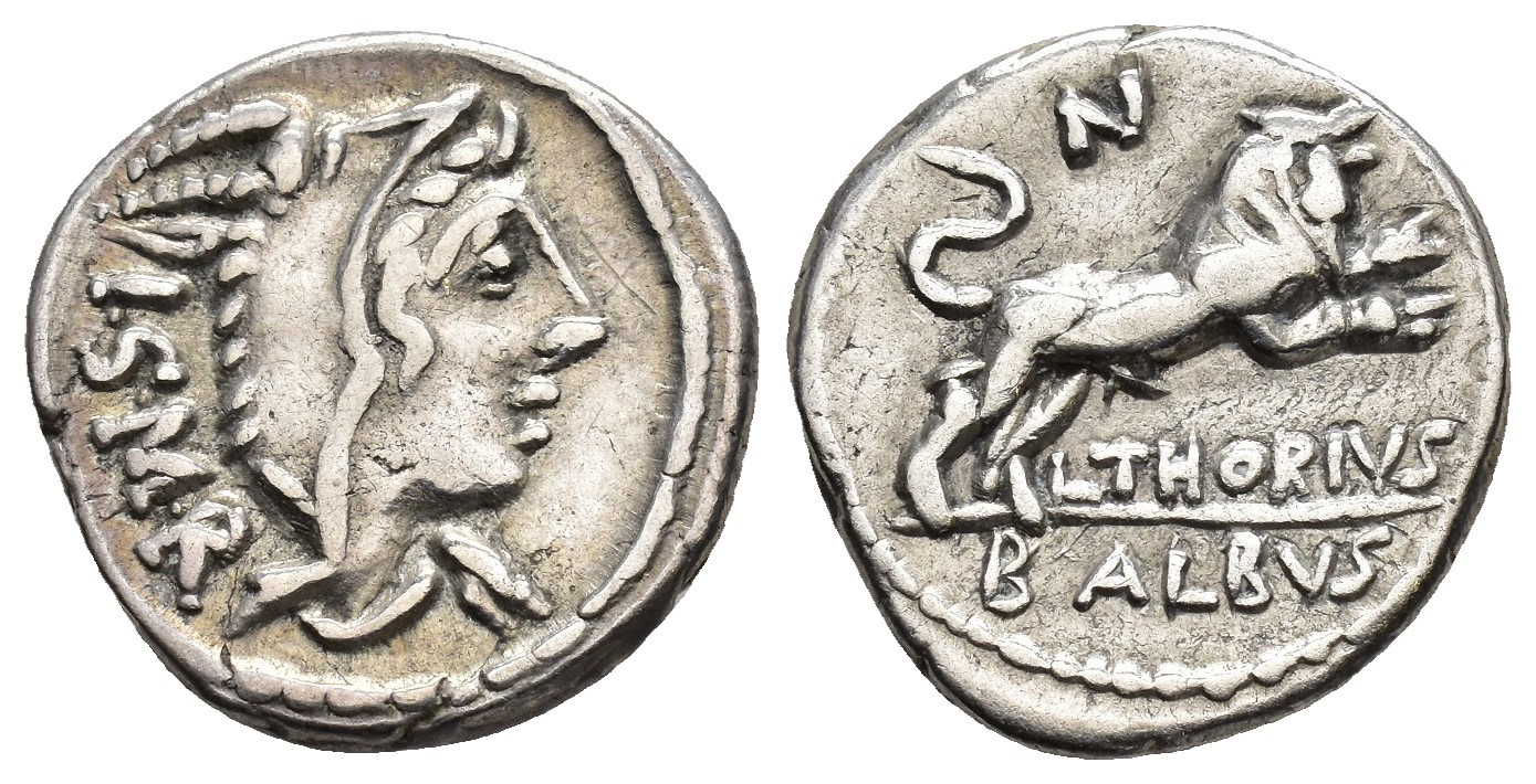 REPÚBLICA ROMANA. THORIA. L. Thorius Balbus. Denario. Norte de Italia (105 a.C.). A/ Cabeza de Juno Sospita a der., detrás I.S.M.R. R/ Toro corriendo a der., encima N; L THORIVS/BALBVS. AR 3,9 g. 18,4 mm. CRAW-316.1; FFC-1141. Grafito en anv. MBC.