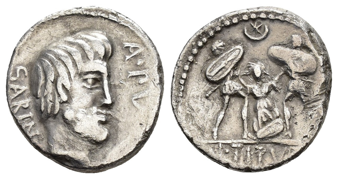 REPÚBLICA ROMANA. TITURIA. L. Titurius L. f. Sabinus. Denario. Roma (89 a.C.). A/ Cabeza de Tacio a der., delante palma, detrás SABIN. R/ Tarpeya de frente enterrada por escudos entre dos soldados , exergo L TITVRI. AR 3,47 g. 17,9 mm. CRAW-344.2b; FFC-1156. Rayas en rev. MBC-.