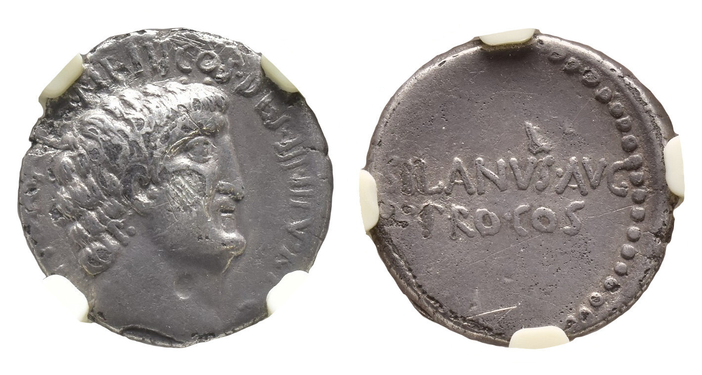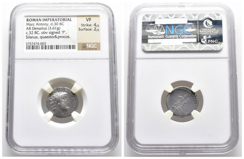 PERIODO DE JULIO CÉSAR A AUGUSTO. MARCO ANTONIO. M. Junius Silanus. Ceca móvil. Denario (33 a.C.). A/ Cabeza a der. (ANTON AVG) IMP III COS DES III III V R P C. R/ M SILANVS/AVG/ Q PRO COS. AR. CRAW-542.1; FFC-69. Encapsulada por NGC-VF.