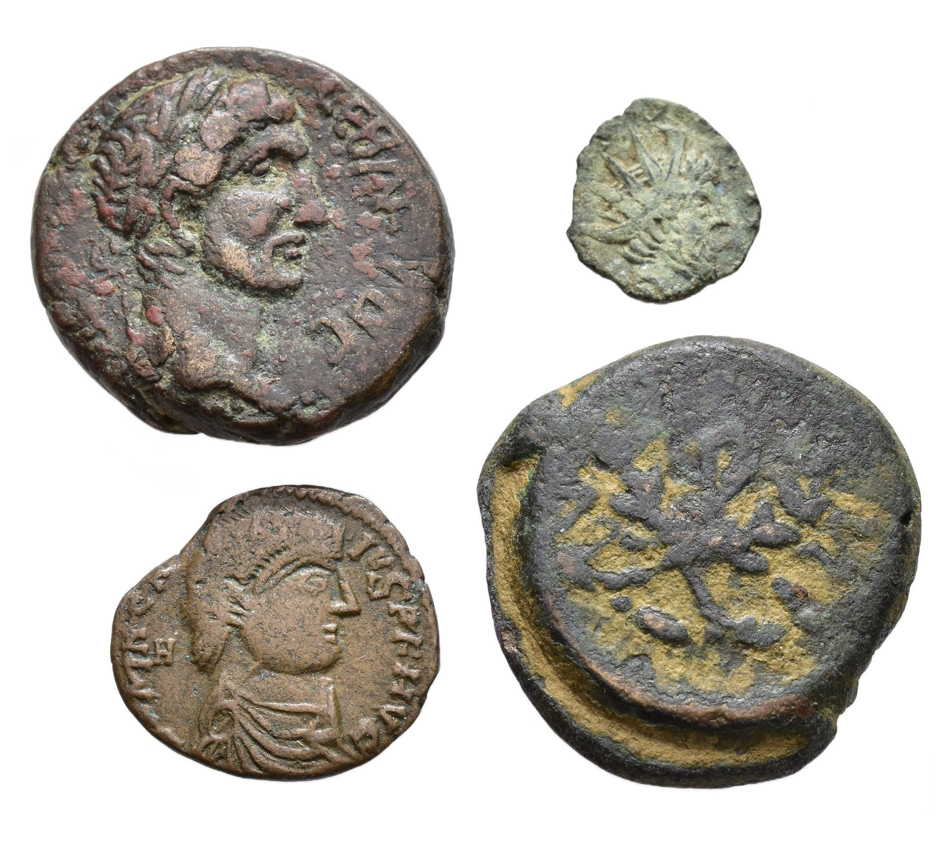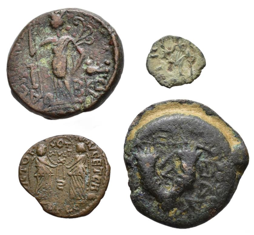 IMPERIO ROMANO. Lote de 4 piezas: 2 AE greco-romanos, 1 follis de módulo pequeño y 1 antoniniano falso de época. De RC a MBC-.