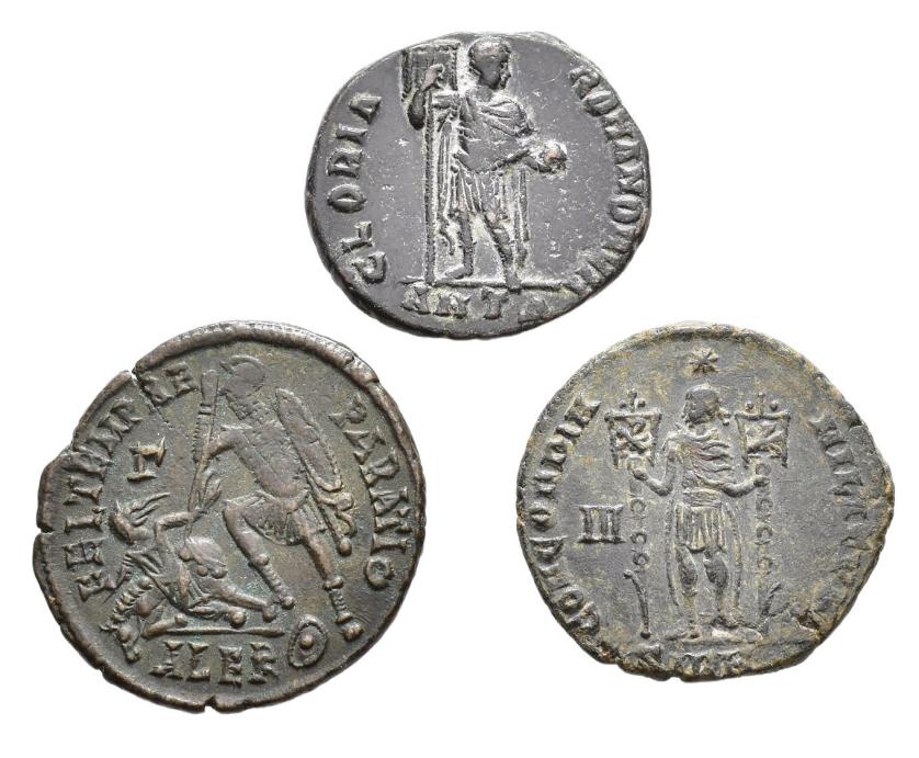IMPERIO ROMANO. Lote de 3 follis de módulo grande: Constancio Galo, Constancio II y Teodosio. MBC-/MBC.