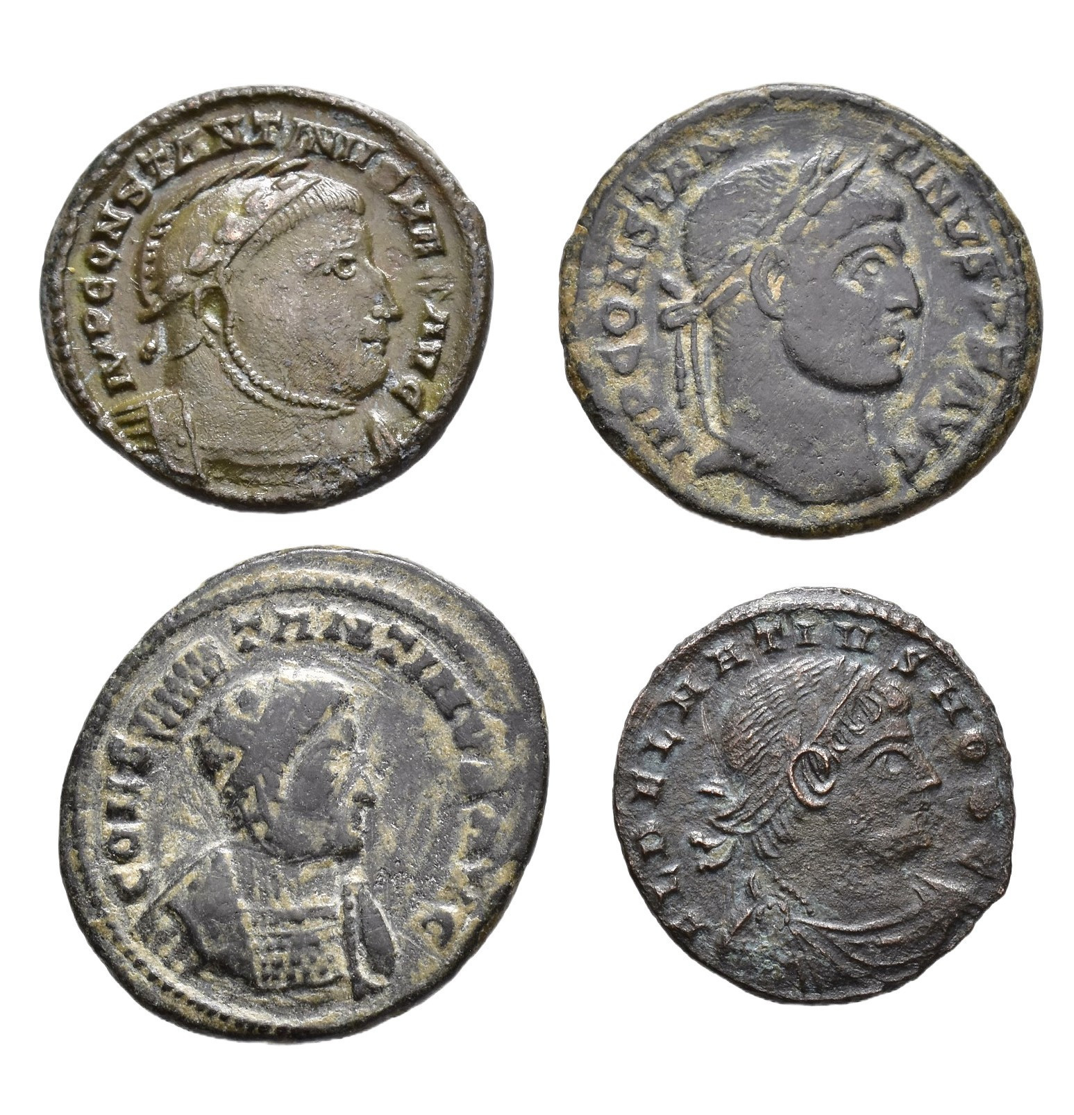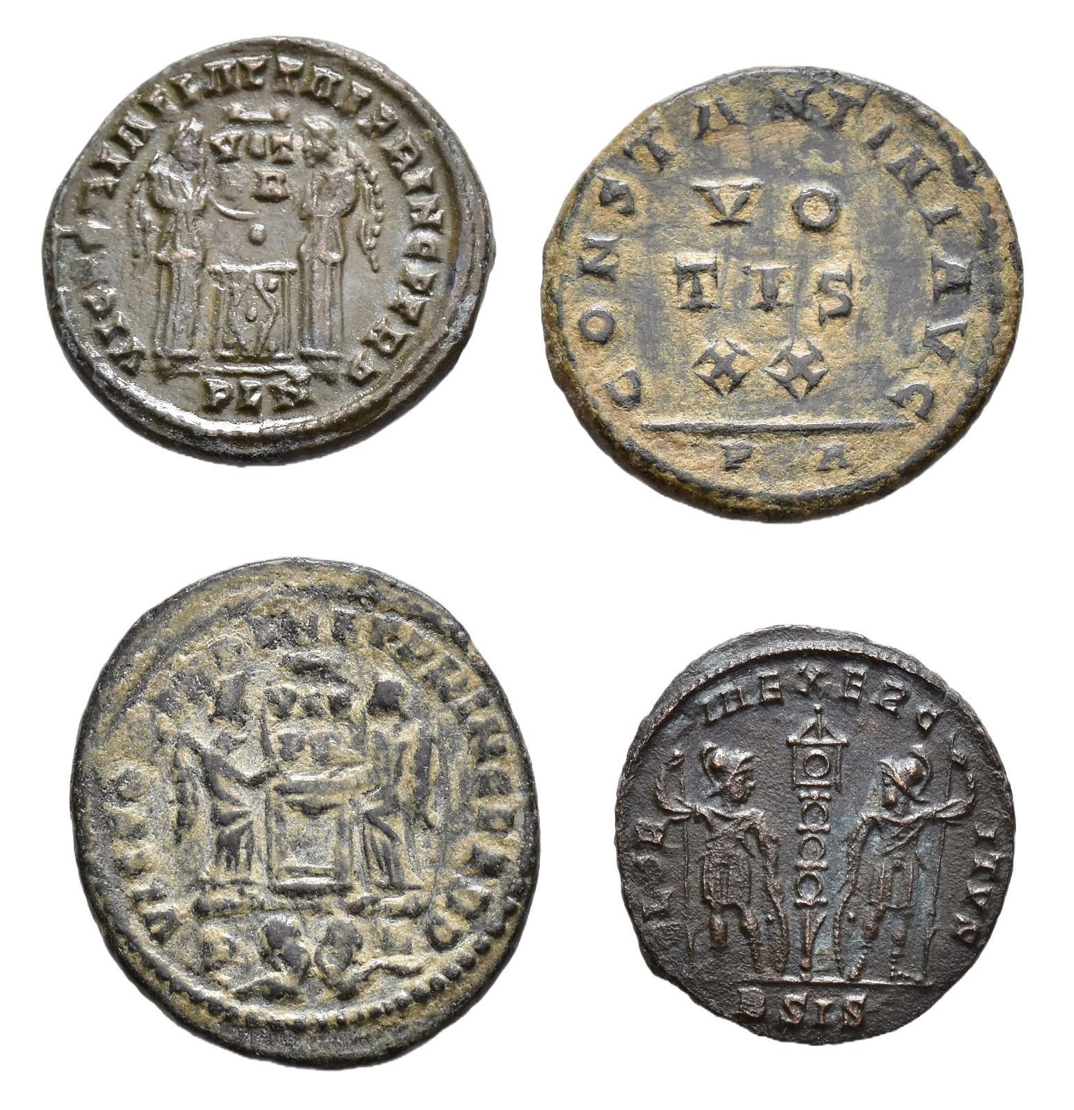 IMPERIO ROMANO. Lote de 4 bronces pequeños de época constantiniana con reversos escasos y uno de Dalmacio. BC+/MBC+.