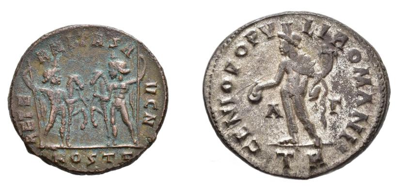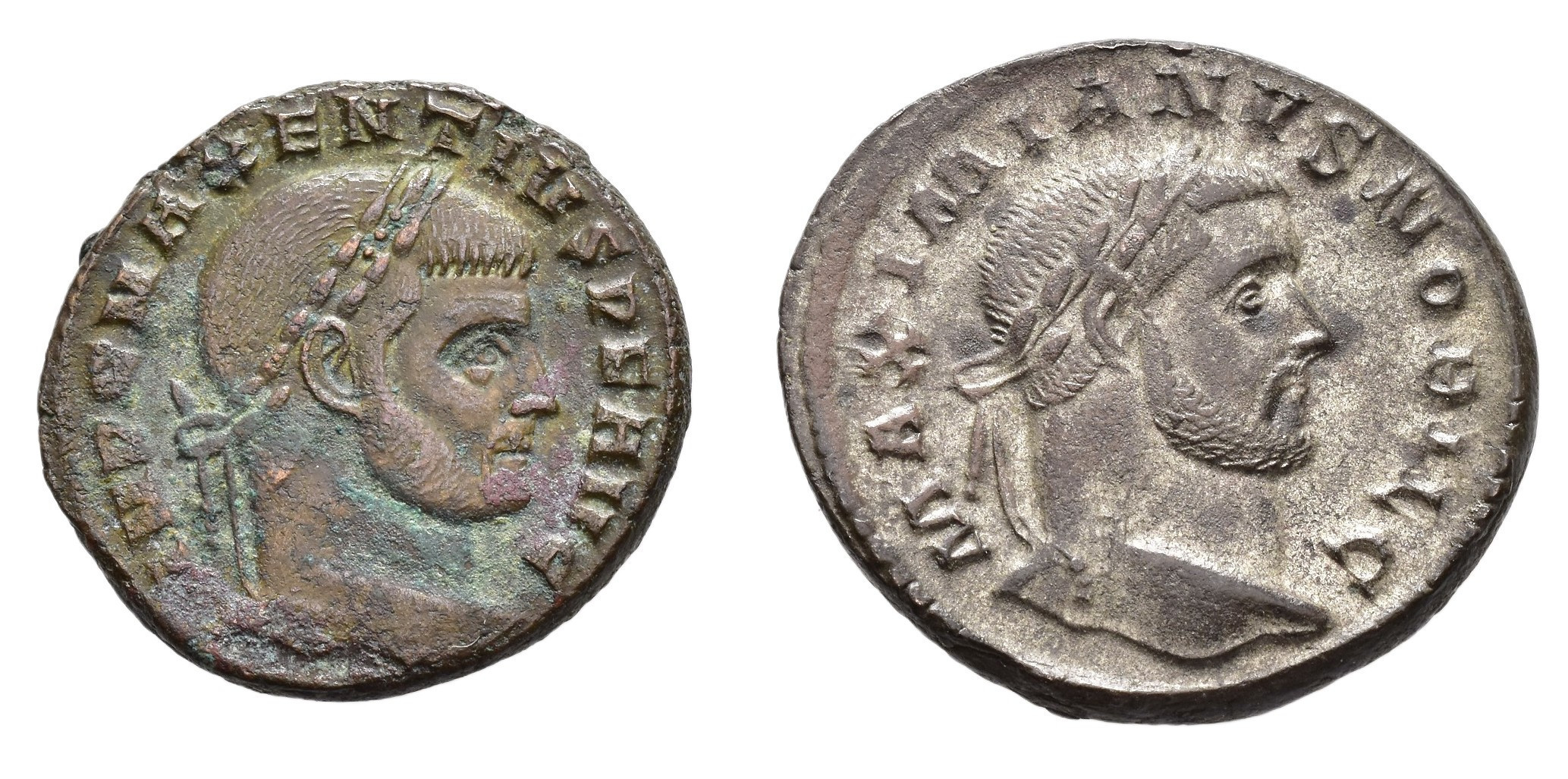 IMPERIO ROMANO. Lote de 2 follis: Maximiano y Majencio. MBC/MBC+.