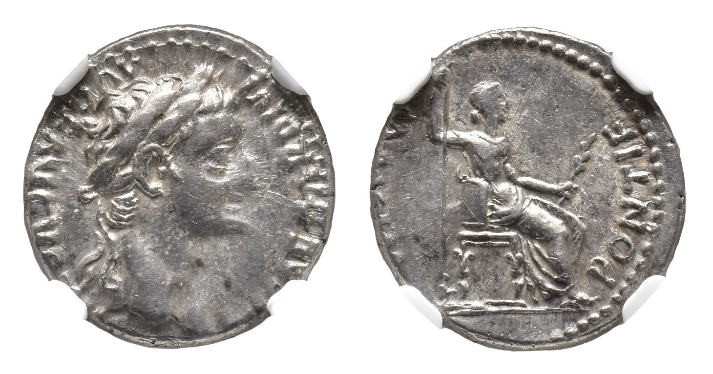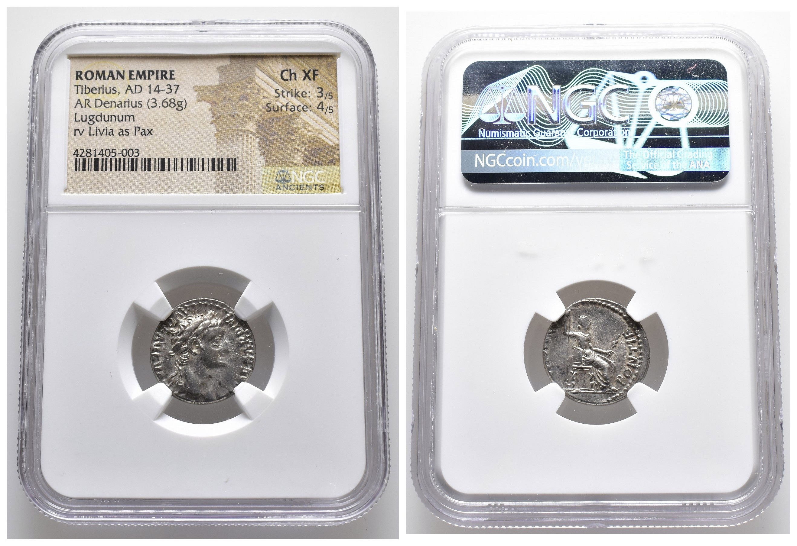 IMPERIO ROMANO. TIBERIO (14-37 d.C.). Denario. Lugdunum (36-37 d.C.). A/ Busto laureado a der. TI CAESAR DIVI AVG F AVGVSTVS. R/ Livia sentada a der. en trono con patas sin adornos y sobre dos líneas; PONTIF MAXIM. RIC-26. Encapsulada por NGC-Ch XF.