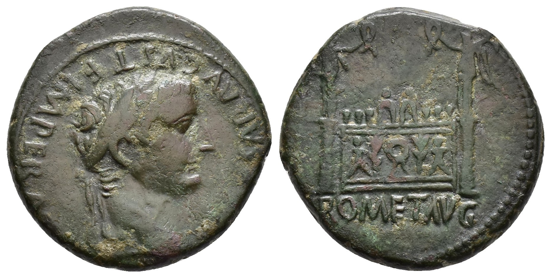 IMPERIO ROMANO. TIBERIO (14-37 d.C.). As. Lugdunum (13-14 d.C.). A/ Cabeza laureada a der. R/ Altar decrorado con corona cívica y flanqueado por columnas; ROM ET AVG. AE 11,62 g. 25 mm. RIC-245. MBC-.