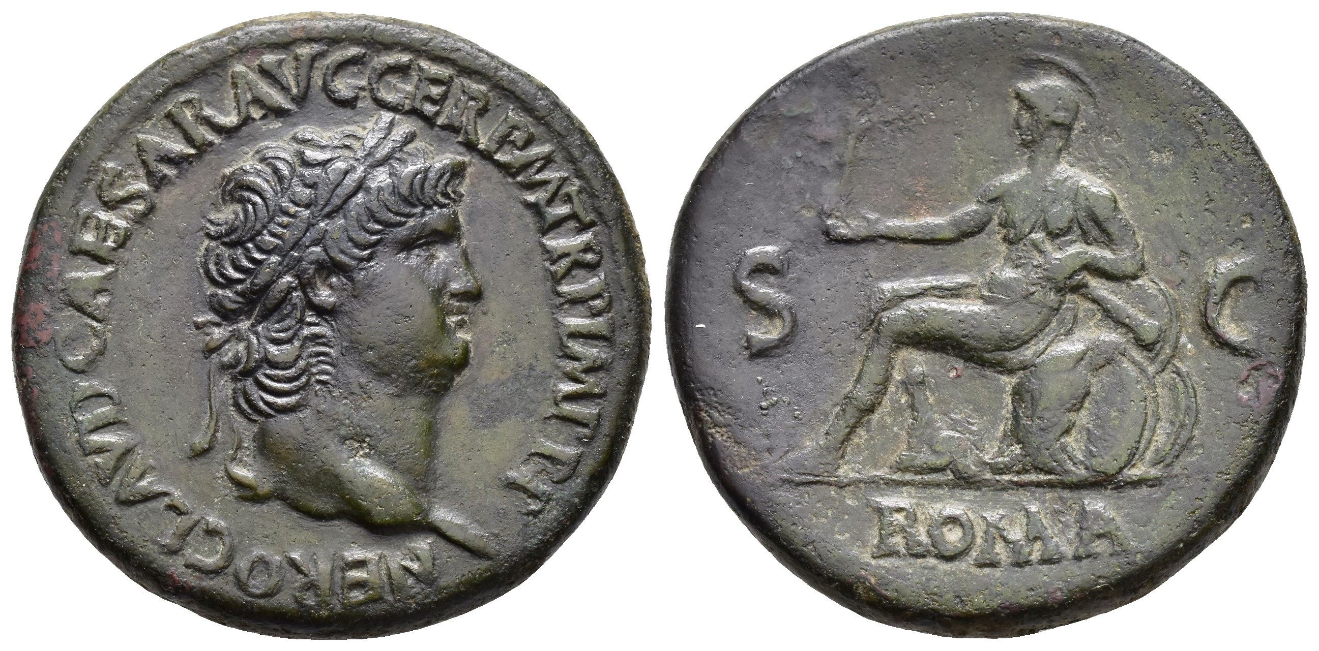 IMPERIO ROMANO. NERÓN (54-68 d.C.). Sestercio. Roma (65 d.C.). A/ Cabeza laureada a der.; NERO CLAVD CAESAR AVG GERM TR P IMP P P. R/ Roma en traje militar sentada a izq. sobre coraza y escudos, sosteniendo victoria y cetro; S-C, exergo ROMA. AE 26 g. 34,5 mm. RIC-398. Pátina verde oscuro. EBC-/MBC-.