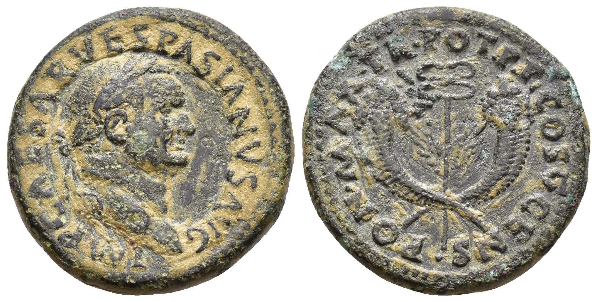 IMPERIO ROMANO. VESPASIANO (69-79 d.C.). Roma. Dupondio (74 d.C.). A/ Cabeza laureada a der.; IMP CAESAR VESPASIANVS AVG. R/ Dos cornucopias cruzadas, en medio caduceo; PON MAX TR POT P P COS V CENS. AE 13,11 g. 27,4 mm. RIC-758. MBC-/MBC.