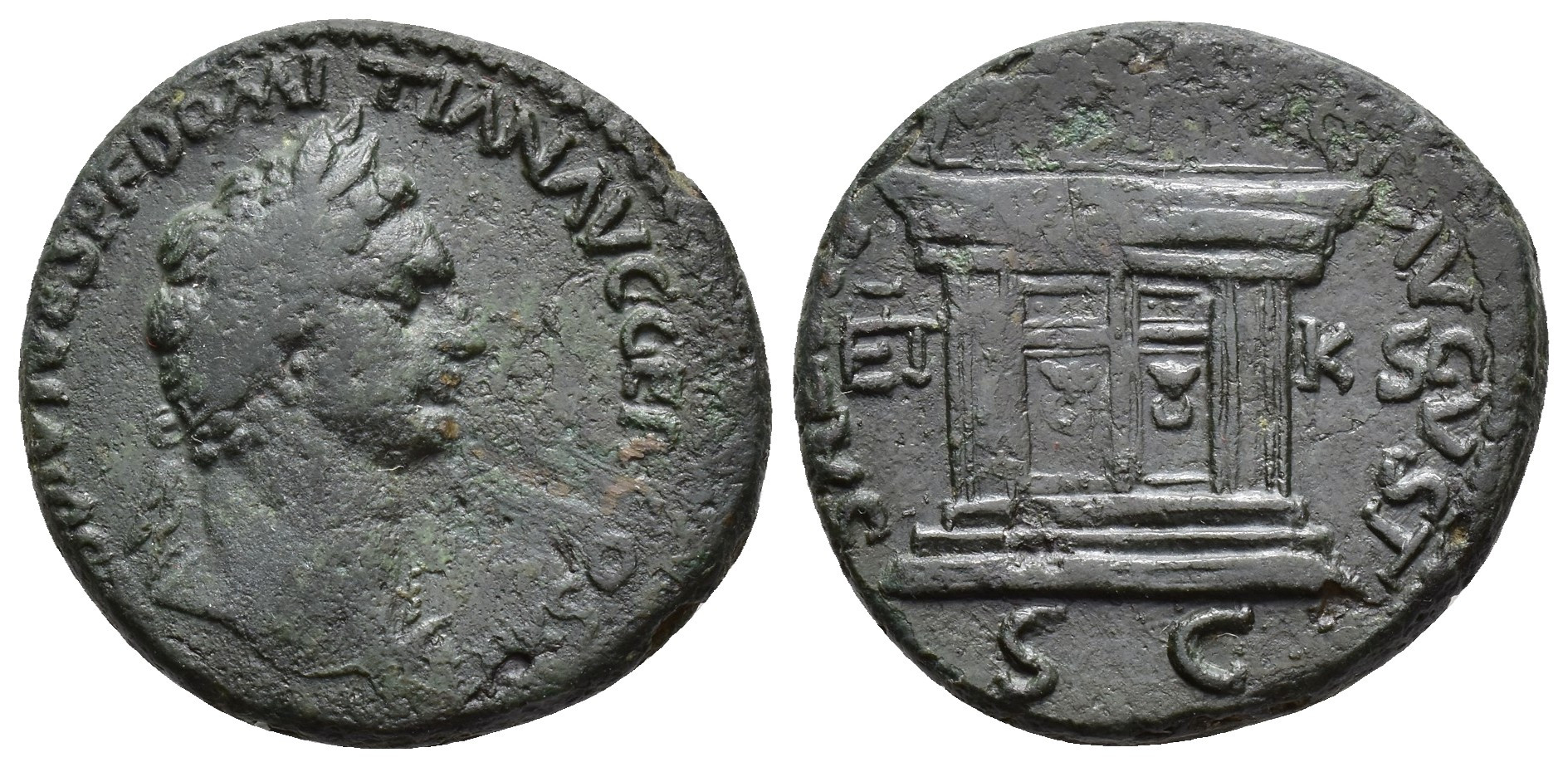 IMPERIO ROMANO. DOMICIANO (81-96 d.C.). Caesarea Maritima. AE 27 (Acuñado por Agripa III.). A/ Cabeza laureada a der.; (IMP CAE)S DIVI VESP F DOMITIAN AVG GER COS (XII). R/ Altar; ET-KS; SA(LVTI) AVGVST. AE 10,94 g. 24,6 mm. RPC-II.2270. Pátina oscura. BC/MBC.