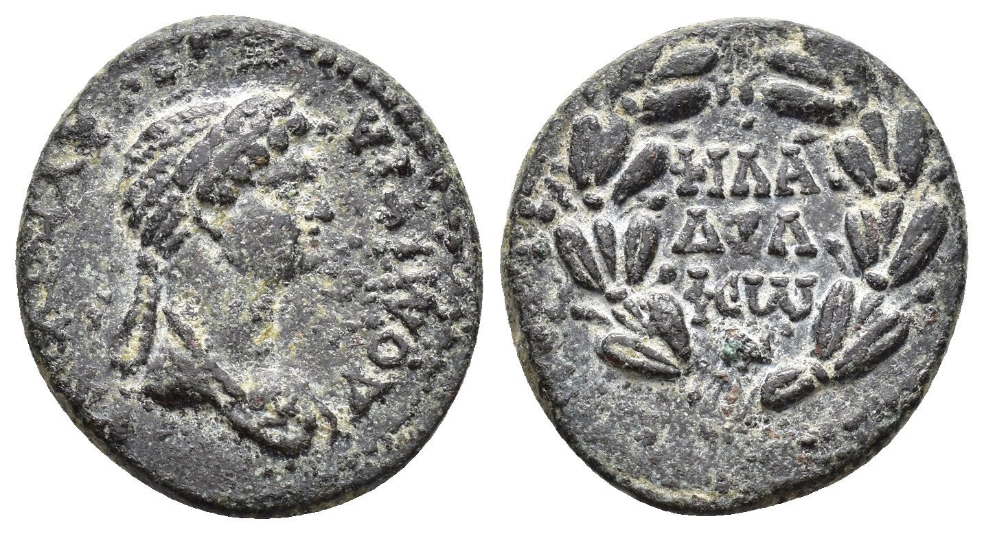 IMPERIO ROMANO. DOMICIA. Filadelfia. AE-19. A/ Busto drapeado a der. R/ Corona de laurel rodeando ley. griega en tres líneas. AE 4,84 g. 20,8 mm. RPC-II.1340. Concreciones. Pátina socura. MBC/MBC+. Rara.