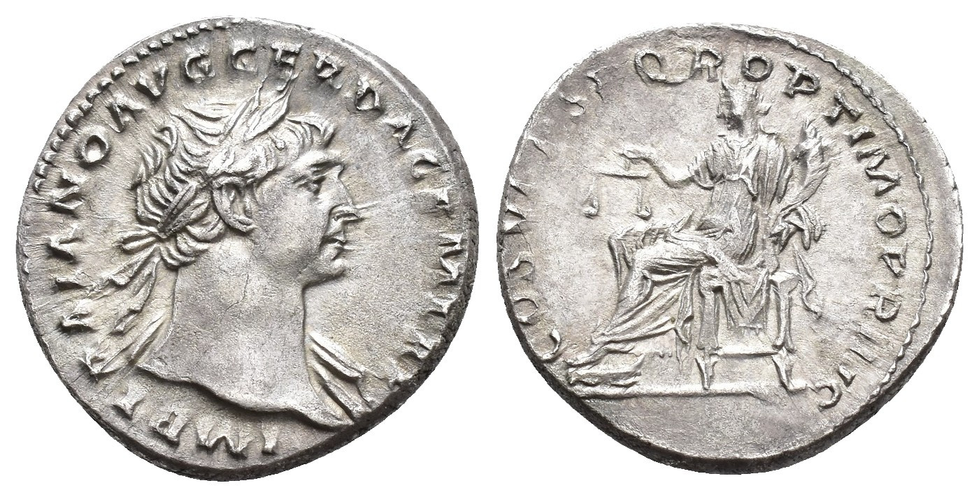 IMPERIO ROMANO. TRAJANO. Roma. Denario (103-111). A/ Cabeza laureada, drapeada al hombro a der.; IMP TRAIANO AVG GER DAC P M TR P. R/ Aequitas sentada a izq. con balanza y cornucopia; COS V P P SP Q R OPTIMO PRINC. AR 3,3 g.18,1 mm. RIC-119. EBC-.