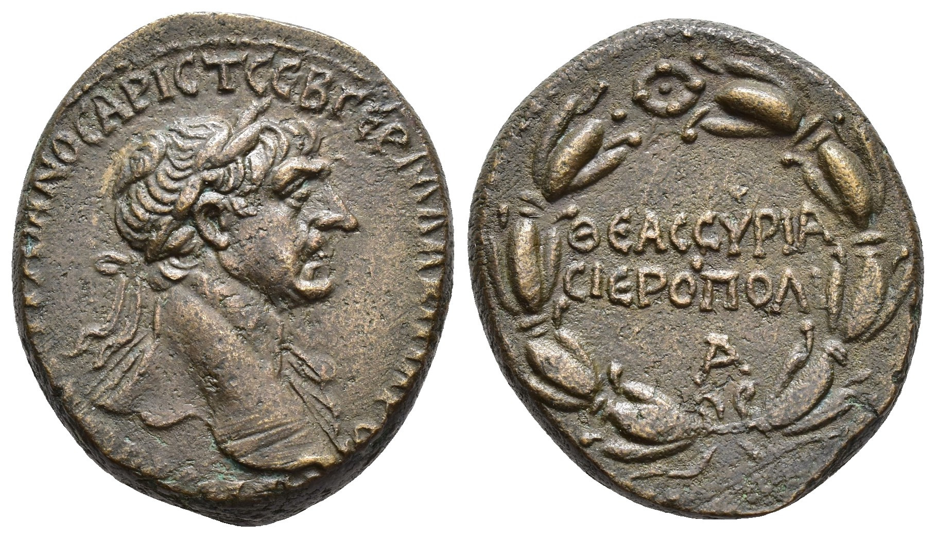 IMPERIO ROMANO. TRAJANO (98-117 d.C.). Hierópolis (Siria). AE-24. A/ Cabeza laureada y drapeada a der. R/ Láurea rodenado leyenda griega en tres líneas. AE 16,33 g. 27,3 mm. RPC-III.3454. MBC+.