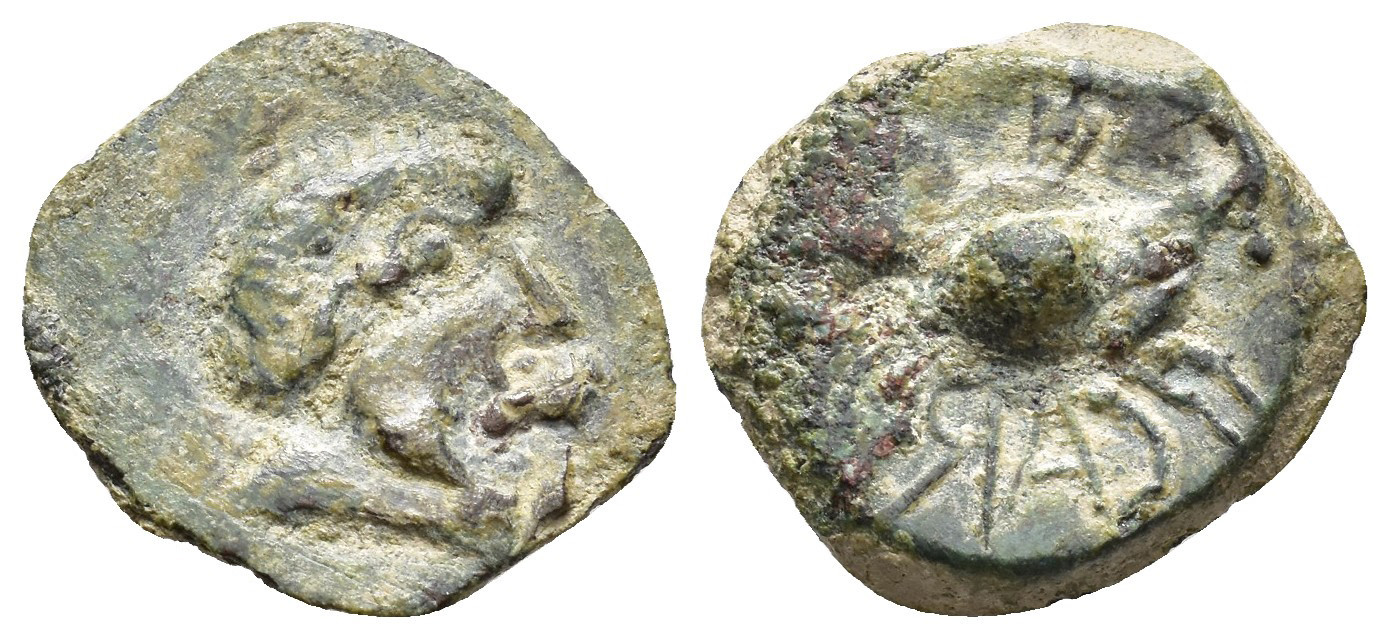 HISPANIA ANTIGUA. CARISA. Semis. A/ Cabeza masculina a der. R/ Jinete con rodela de gran relieve a izq., debajo CARISA retrógrada. AE 3,08 g. CNH-8. ACIP-2520. CC-3373, mismo ejemplar. Pátina verde con concreciones. MBC. Rara.