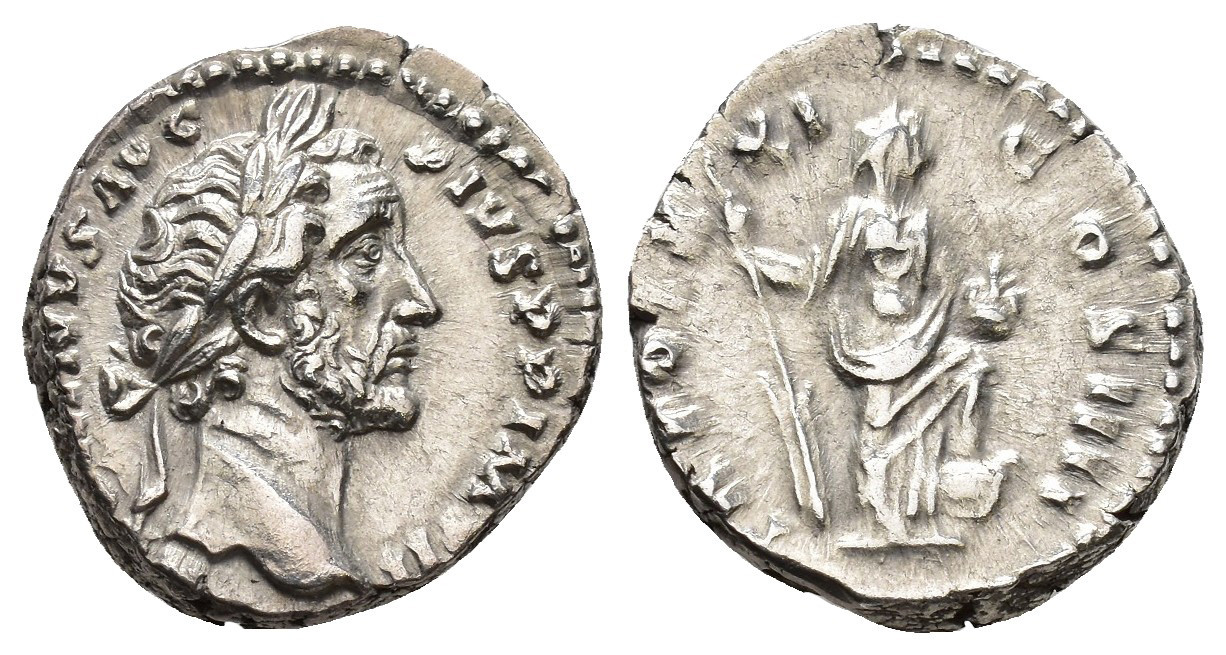 IMPERIO ROMANO. ANTONINO PÍO (138-161). Roma. Denario (157-158). A/ Cabeza laureada a der.; (ANTON)INVS AVG PIVS P P IMP II. R/ Annona a der. con timón, modio y pie sobre proa; TR POT XXI COS IIII. AR 3,2 g. 16,7 mm. RIC-275. MBC+/MBC.