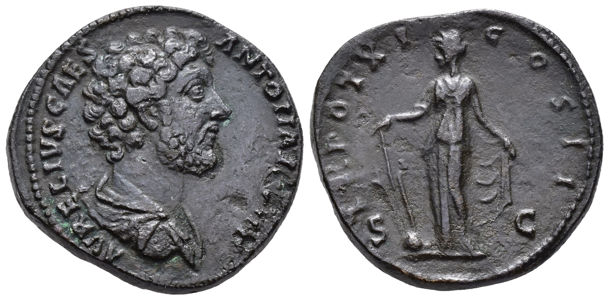 IMPERIO ROMANO. MARCO AURELIO (161-180). Roma. Sestercio (155-157). A/ Busto drapeado y acorazado a der.; AVRELIVS CAES ANTON AV(G PII F). R/ Fortuna a izq. con timón y sujetándose el vestido; TR POT XI COS II, S-C. AE 24,59 g. 32,3 mm. RIC-1338B. Erosión en anv. Pátina oscura. MBC+/MBC.