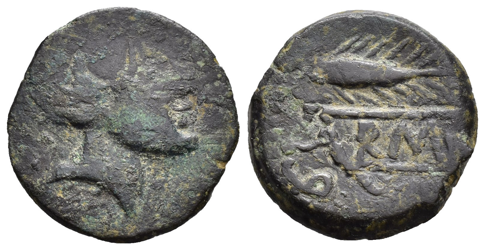 HISPANIA ANTIGUA. CARMO. As. A/ Cabeza masculina a der., detrás delfín. R/ Dos espigas a der. en medio entre líneas ley. CARMO. Reacuñada sobre Albatha. AE 5,57 g. 21,6 mm. I-459; ACIP-2404. CC-3474, mismo ejemplar. Pátina oscura. BC/MBC. Rara.