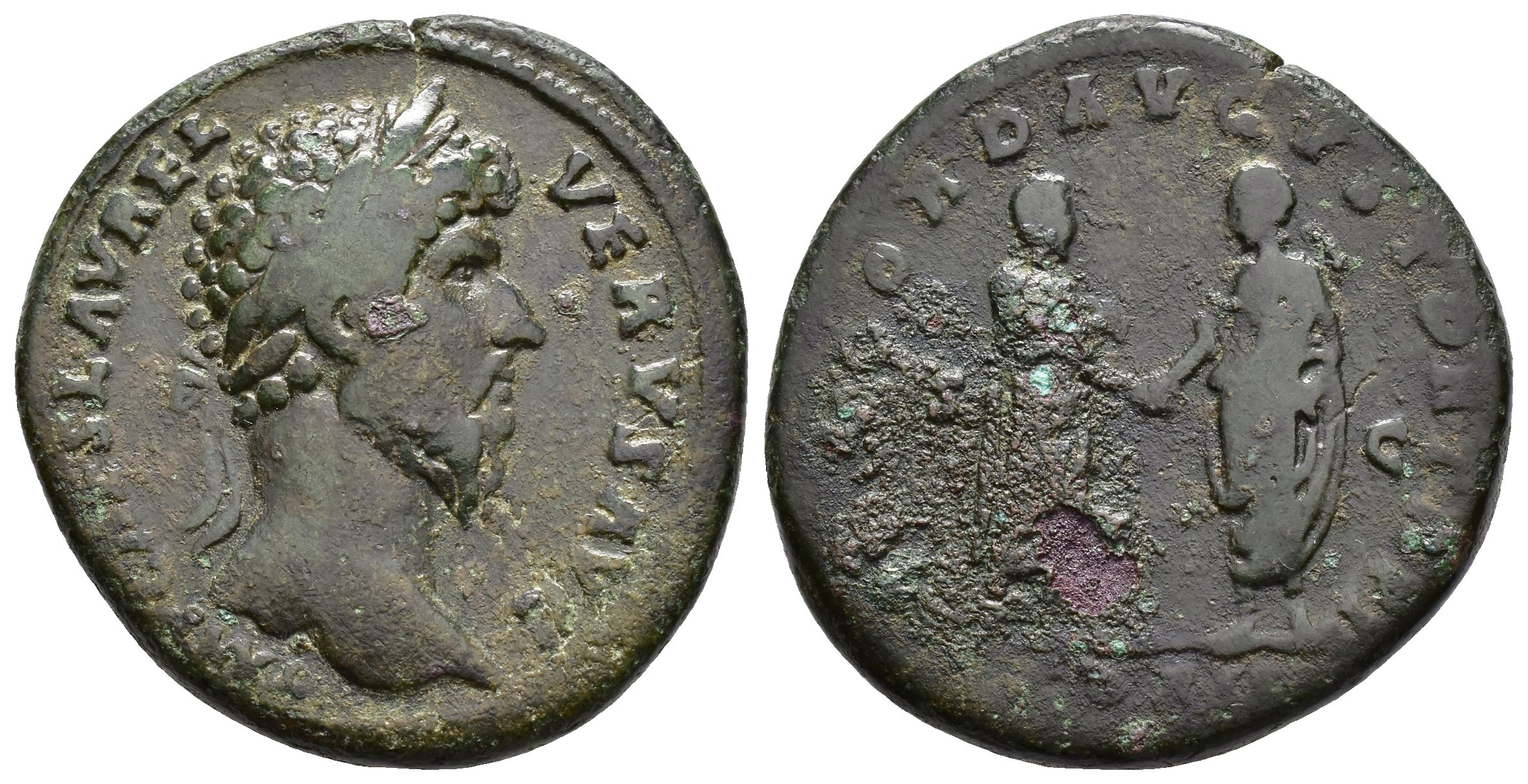 IMPERIO ROMANO. LUCIO VERO (161-169). Roma. Sestercio (161). A/ Cabeza laureada a der.; IMP CAES L AVREL VERVS AVG. R/ Marco Aurelio y Lucio Vero togados dándose la mano; (CON)CORD AVGVSTOR TR P (COS II), S-C. AE 22,22 g. 32,4 mm. RIC-1281. Concreción en rev. Pátina verde. BC+.