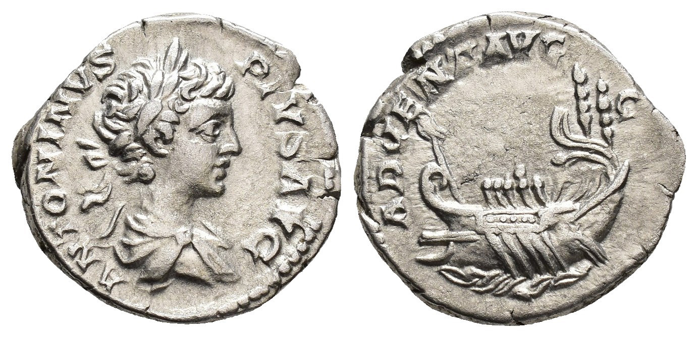 IMPERIO ROMANO. CARACALLA (211-217). Roma. Denario (201-206). A/ Busto laureado y drapeado a der.; ANTONINVS PIVS AVG. R/ Galera a izq.; ADVENT AVGG. AE 3,4 g. 17,4 mm. RIC-120. MBC+.