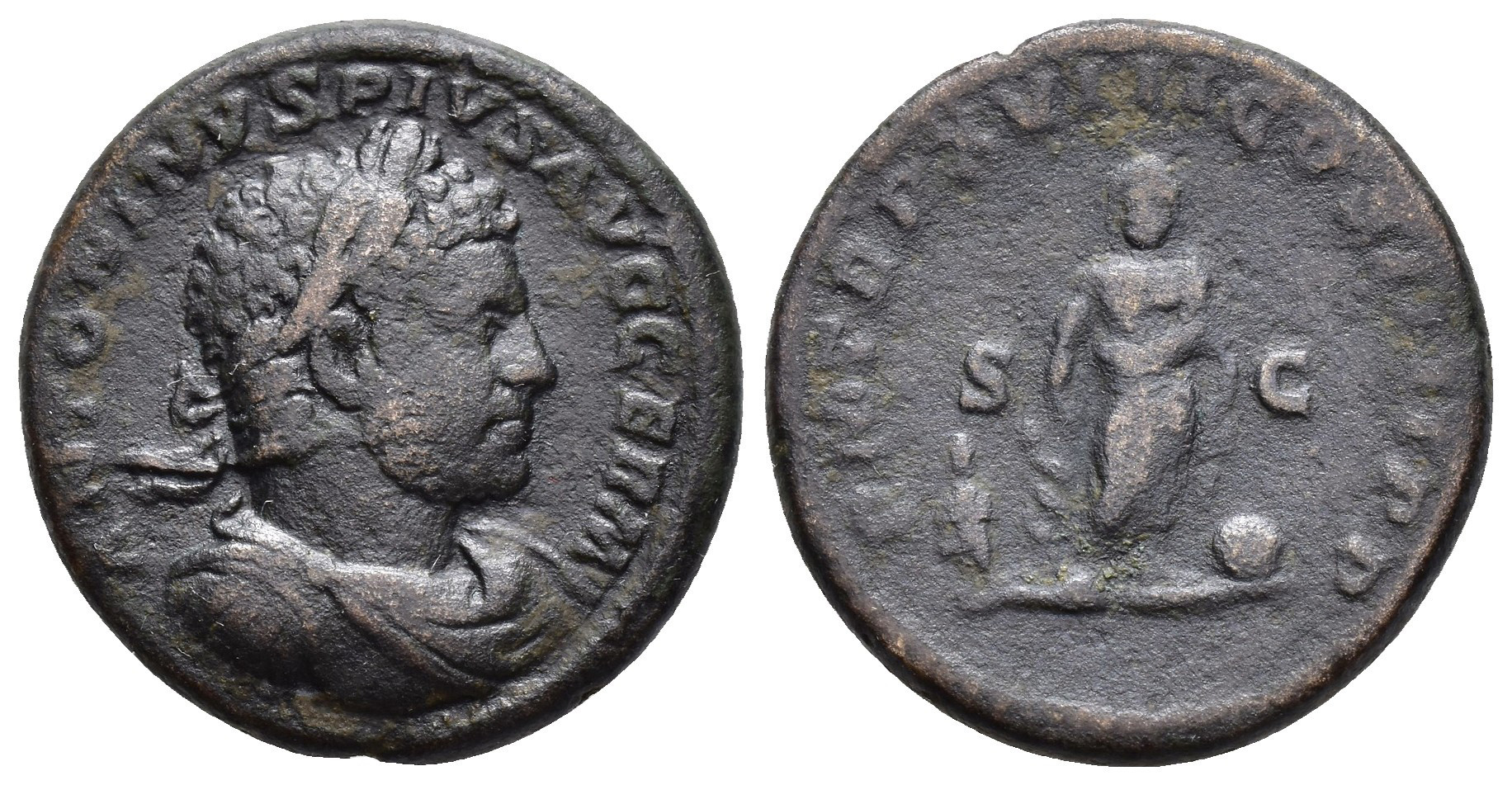 IMPERIO ROMANO. CARACALLA (211-217). Roma. As (215). A/ Busto laureado, drapeado y acorazado a der.; ANTONINVS PIVS AVG GERM. R/ Esculapio con su vara, a izq. Telesforo y a der. globo; P M TR P XVIII COS IIII P P, S-C. AE 10,09 g. 25,1 mm. RIC-554B. MBC-/BC+.