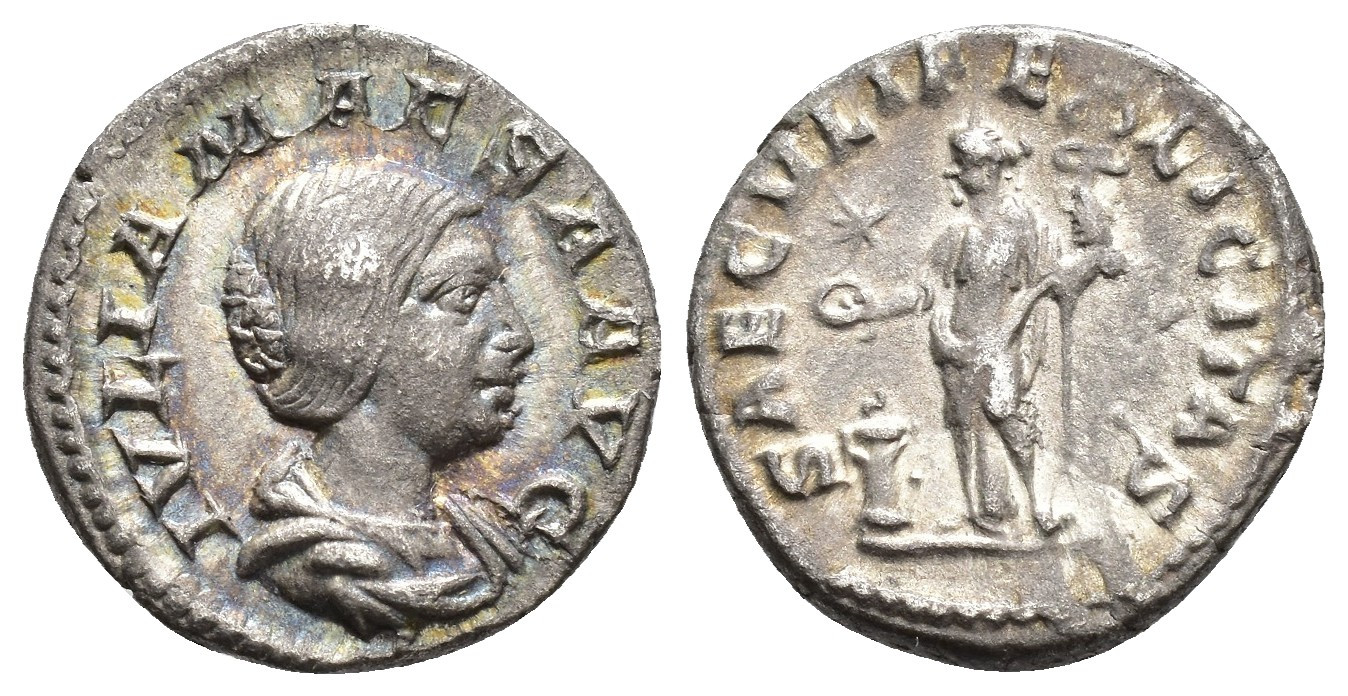 IMPERIO ROMANO. JULIA MESA. Roma. Denario (218-222). A/ Busto drapeado a der.; IVLIA MAESA AVG. R/ Felicitas a izq. con caduceo y pátera ofrendando en altar ante ella; SAECVLI FELICITAS. AR 3,05 g. 18,1 mm. RIC-272. MBC.