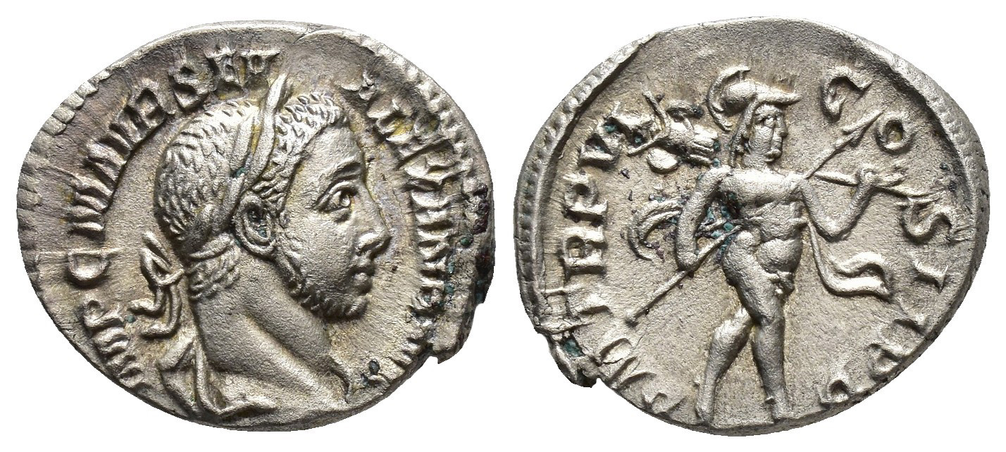 IMPERIO ROMANO. ALEJANDRO SEVERO (222-235). Roma. Denario (227). A/ Busto laureado y drapeado a der.; IMP C M AVR SE ALEXAN (AVG). R/ Marte avanzando a der. con trofeo y lanza; P M TR P VI COS II P P. AR 3,03 g. 16,3 mm. RIC-61. MBC+.