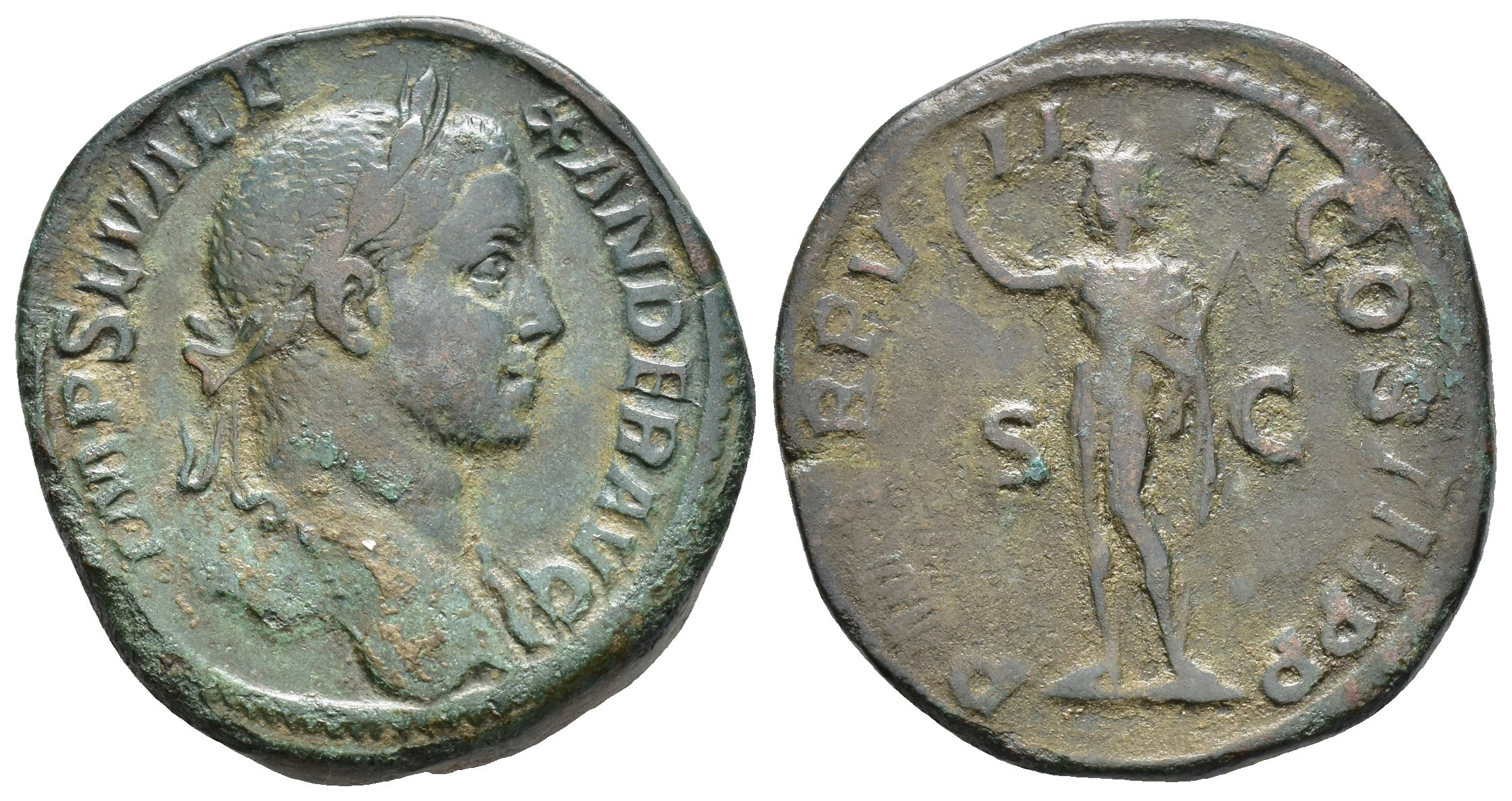IMPERIO ROMANO. ALEJANDRO SEVERO (222-235). Roma. Sestercio (230). A/ Busto laureado y drapeado al hombro a der.; IMP SEV ALEXANDER AVG. R/ Sol con látigo a izq.; P M TR P VIIII COS III P P. AE 28,55 g. 31,4 mm. RIC-500. Pátina verde. MBC/BC+.