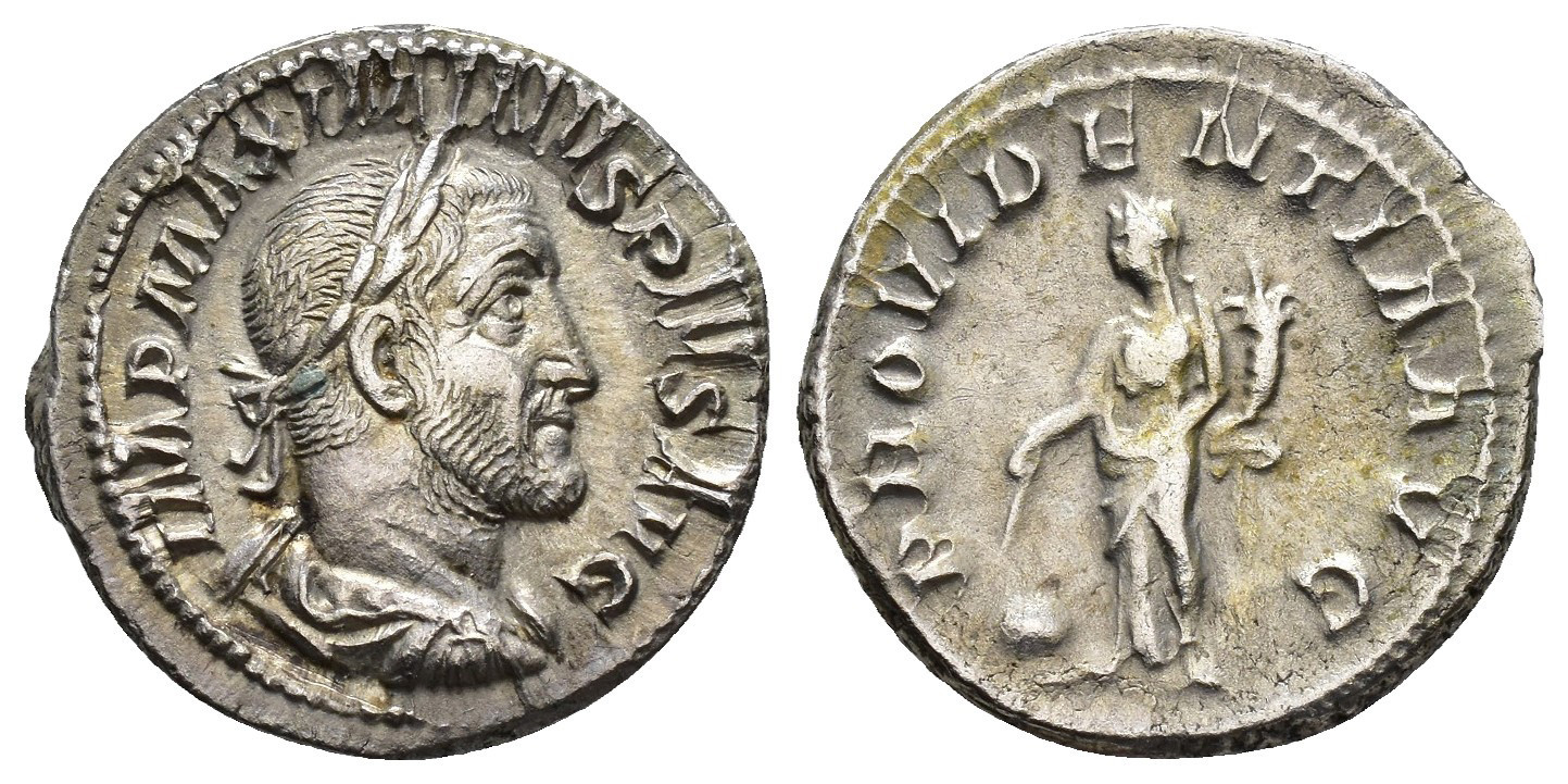 IMPERIO ROMANO. MAXIMINO (235-238). Roma. Denario (235-236). A/ Busto laureado, drapeado y acorazado a der.; IMP MAXIMINVS PIVS AVG. R/ Providentia a izq. con cornucopia, vara y globo a sus pies.; PROVIDENTIA AVG. AR 3,51 g. 19 mm. RIC-13. MBC+/MBC-.