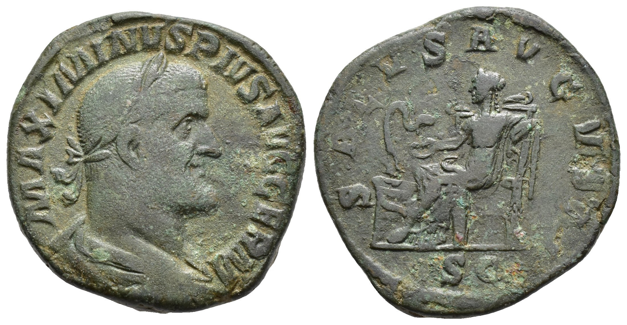 IMPERIO ROMANO. MAXIMINO (235-238). Roma. Sestercio (236-238). A/ Busto laureado, drapeado y acorazado a der.; MAXIMINVS PIVS AVG GERM. R/ Salus sentada a izq. alimentando serpiente enroscada en altar; SALVS AVGVSTI, exergO S C. AE 21,35 g. 29,3 mm. RIC-85. Pátina verde. MBC-.