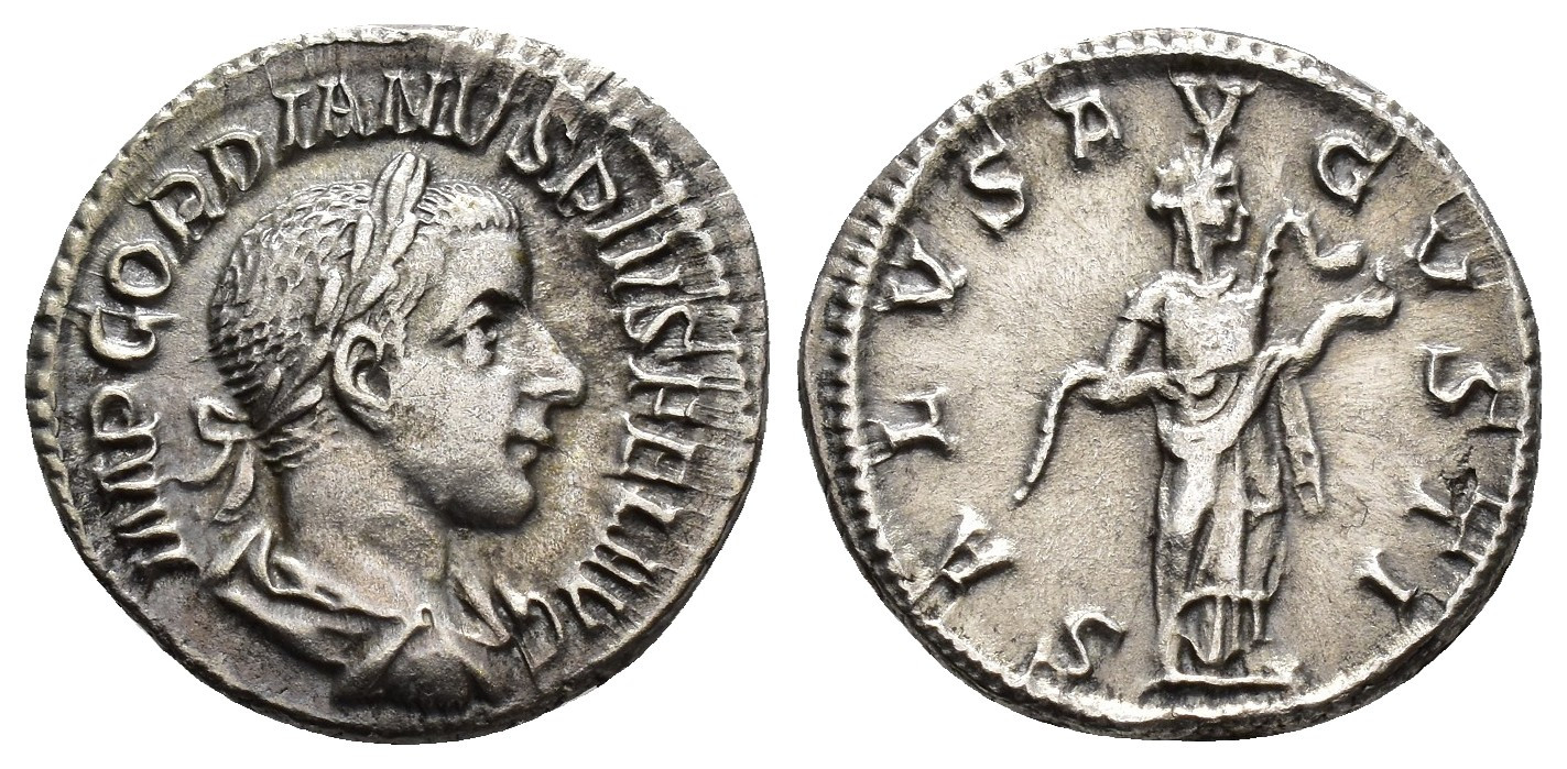 IMPERIO ROMANO. GORDIANO III (238-244). Roma. Denario (241). A/ Busto laureado, drapeado y acorazado a der.; IP GORDIANVS PIVS FEL AVG. R/ Salus a der. alimentando serpiente en sus brazos; SALVS AVGVSTI. AR 2,49 g. 18,1 mm. RIC-129A. MBC.