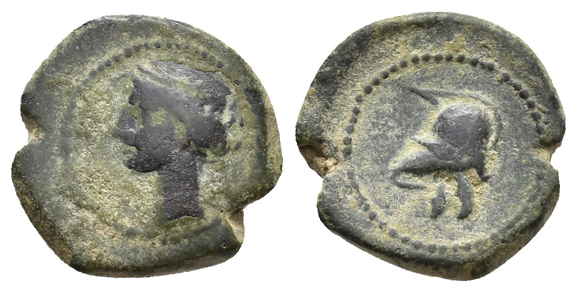 HISPANIA ANTIGUA. EMISIONES HISPANO-CARTAGINESAS. Cuarto. A/ Cabeza de Tanit a izq. R/ Casco a izq. AE 2,65 g. 14 mm. I-521; ACIP-583. Cospel abierto. Pátina oscura. MBC-/MBC. Muy rara.