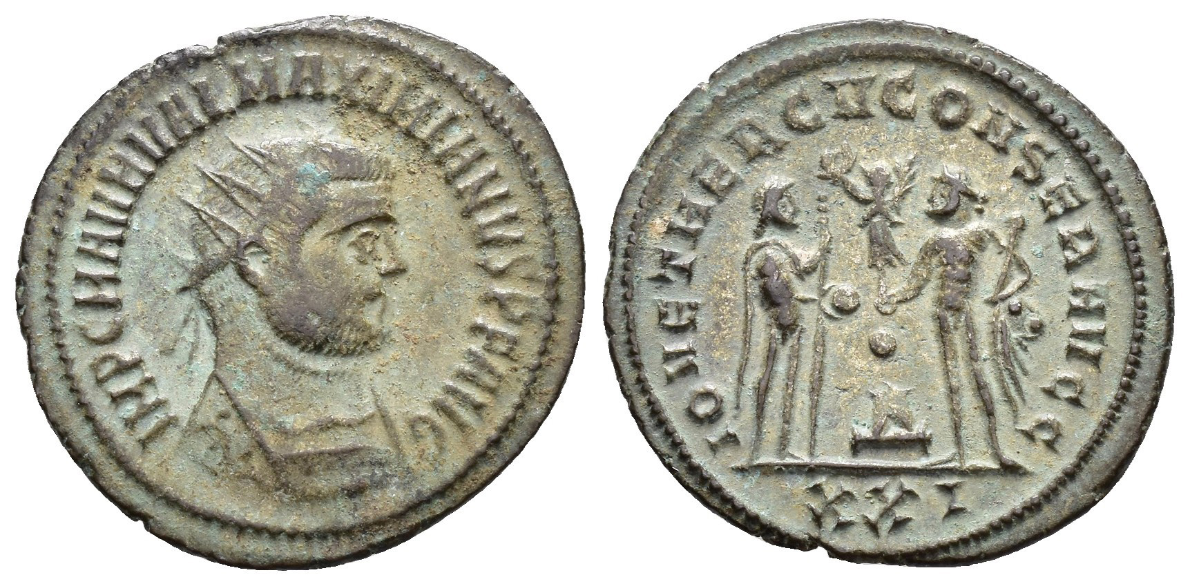 IMPERIO ROMANO. MAXIMIANO (286-305). Antioquía. Antoniniano (285-295). A/ Busto radiado y acorazado a der. R/ Júpiter con victoria a izq., en frente Hérules; IOV ET HERCV CONSER AVGG../D//XXI. AE 3,6 g. 22,2 mm. RIC-622, vte. oficina. MBC.