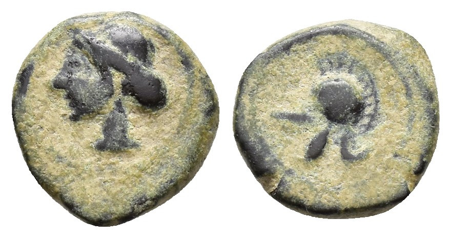 HISPANIA ANTIGUA. EMISIONES HISPANO-CARTAGINESAS. Quinto. A/ Cabeza de Tanit a izq. R/ Casco a izq. AE 1,71 g. 11,6 mm. I-523; ACIP-586. Pátina oscura terrosa. MBC.