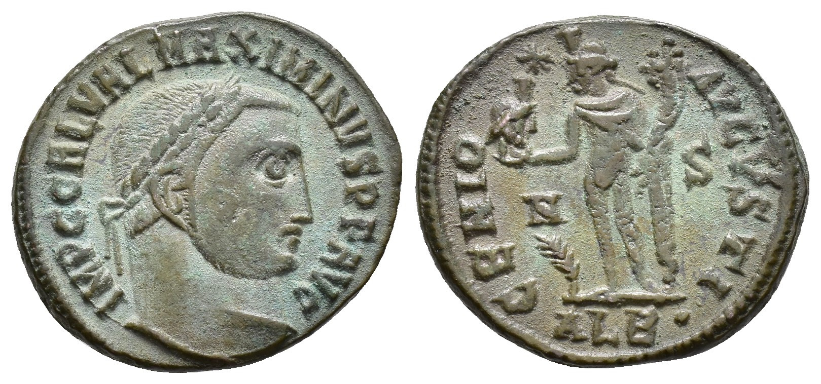 IMPERIO ROMANO. MAXIMINO II (310-313). Alejandría. Follis (312-313). A/ Cabeza laureada a der. R/ Genio con pátera y cornucopia; GENIO AVGVSTI. N/S//ALE. AE 4,9 g. 20,6 mm. RIC-160b. MBC+.