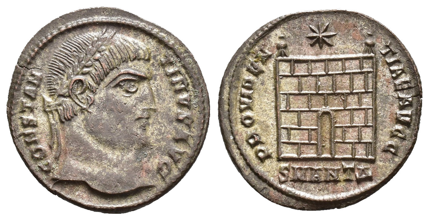 IMPERIO ROMANO. CONSTANTINO I (306-327). Antioquía. Follis (325-326). A/ Cabeza laureada a der.; CONTANTINVS AVG. R/ Puerta de campamento; PROVIDENTIAE AVGG. -/-//SMANTA. AE 2,73 g. 20,5 mm. RIC-63. P.O. Fina grieta.EBC-.