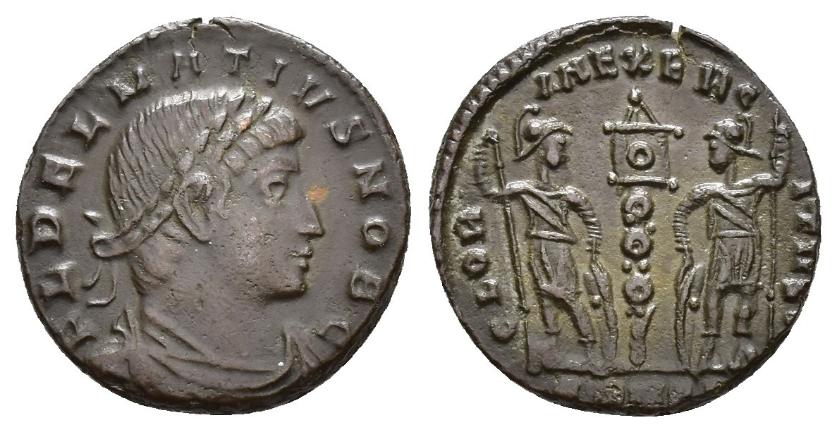 IMPERIO ROMANO. DALMACIO. Constantinopolis. Follis (336-337). A/ Cabeza laureada a der. R/ Dos soldados con estandarte: GLORIA EXERCITVS. -/-/¿CONS? AE 1,8 g. 15,6 mm. RIC-141? MBC.