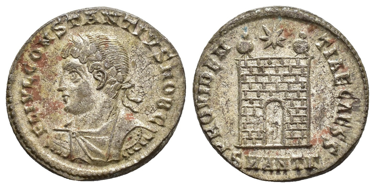 IMPERIO ROMANO. CONSTANCIO II (337-361). Antioquía. Follis (325-336). A/ Busto laureado y acorazado a izq. R/ Puerta de campamento; PROVIDENTIAE CAESS. -/-//SMANTG. AE 3,1 g. 18,5 mm. RIC-66. EBC-.