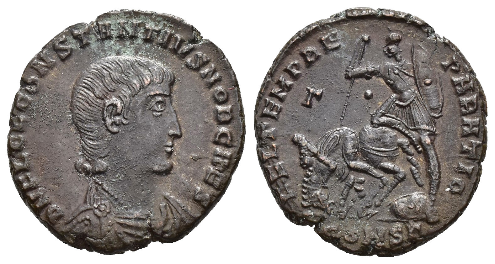 IMPERIO ROMANO. CONSTANCIO GALO. Constantinopolis. Follis (351-354). A/ Busto drapeado a der. R/ Soldado alanceando jinete caído. G./-//CONSG. AE 5,7 g. 21,6 mm. RIC-107. Cospel abierto. MBC/MBC+.