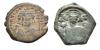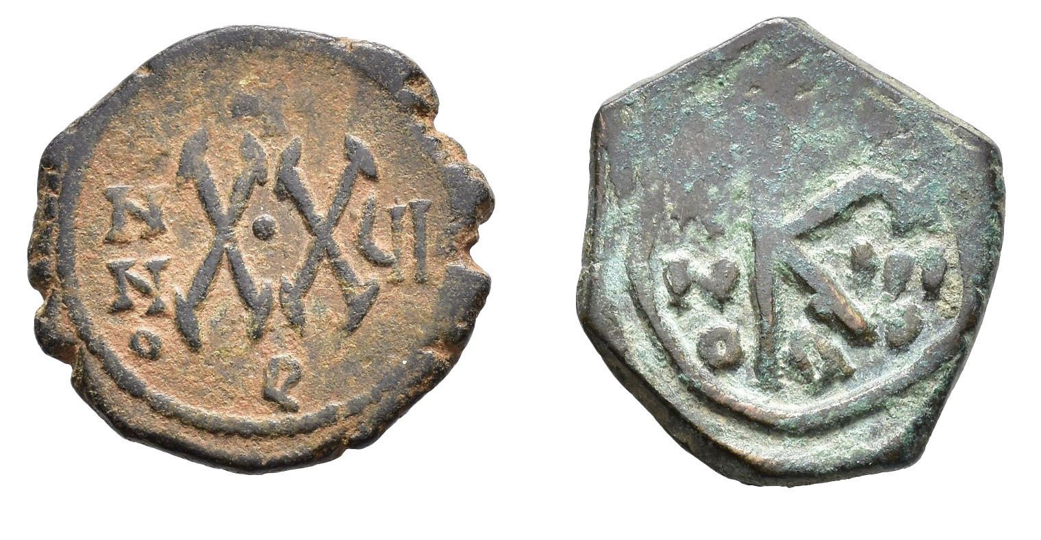IMPERIO BIZANTINO. Lote de 2 piezas: Mauricio Tiberio y medio follis Heraclio. MBC-.
