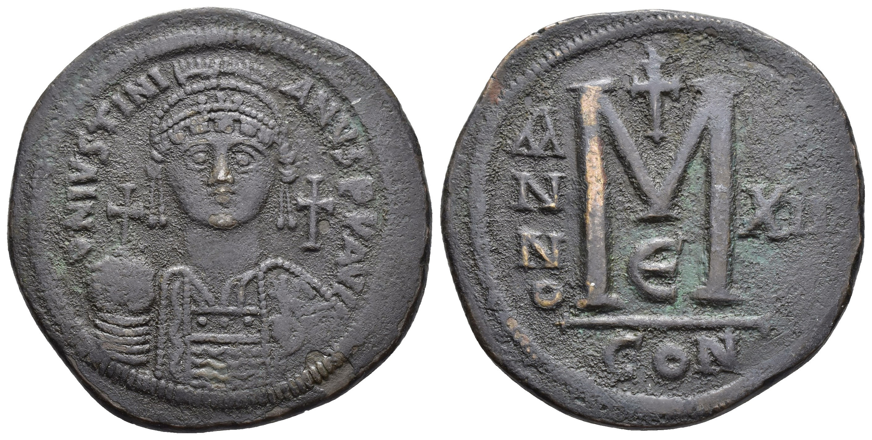 IMPERIO BIZANTINO. JUSTINIANO I (527-565). Constantinopolis. Follis (538-539). A/ Busto frontal del emperador con globo crucífero, a der. cruz, R/ M, exergo CON oficina E, año de reinado XI(I). AE 20,96 g. 38,4 mm. SBB-163. MBC-.