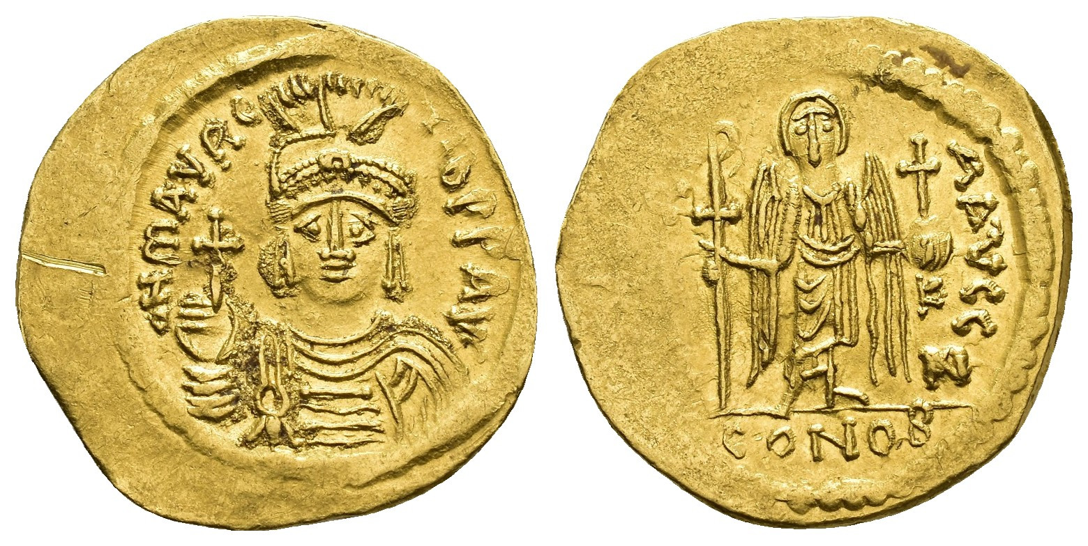 IMPERIO BIZANTINO. MAURICIO TIBERIO (582-602). Sólido. Antioquía. A/ Busto frontal con casco con penacho y globo crucífero. R/ Ángel frontal con bastón rematado en crismón y globo crucífero, a der. K; VICTORIA AVCC Z. -/-//CONOB. AU 4,33 g. 21,5 mm. SBB-526 vte. oficina. Raya en cospel, fuera de gráfila. Vanos. EBC-.
