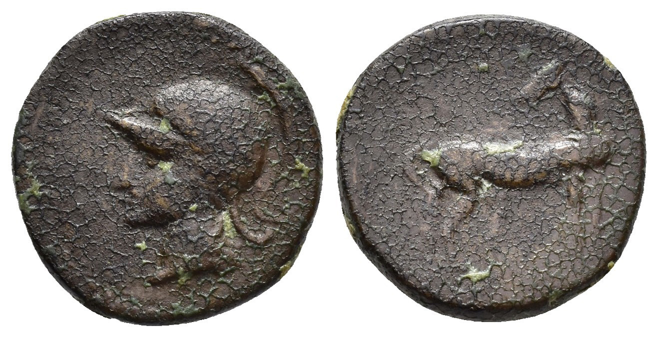 HISPANIA ANTIGUA. EMISIONES HISPANO-CARTAGINESAS. Divisor. A/ Cabeza con casco a izq. R/ Caballo parado a der. con la cabeza vuelta. AE 3,3 g. 17,4 mm. I-517; ACIP-613. Pátina oscura. MBC-/BC+. Muy rara.