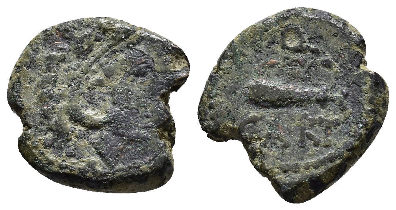 HISPANIA ANTIGUA. CARTEIA. Cuadrante. A/ Cabeza de Hércules con leonté a der. R/ Clava tumbada; encima Q y 3 glóbulos, debajo CART. AE 5,02 g. 16,5 mm. ACIP-2548; CC-3496, mismo ejemplar. Cospel irregular. BC-/BC+. Rarísima.